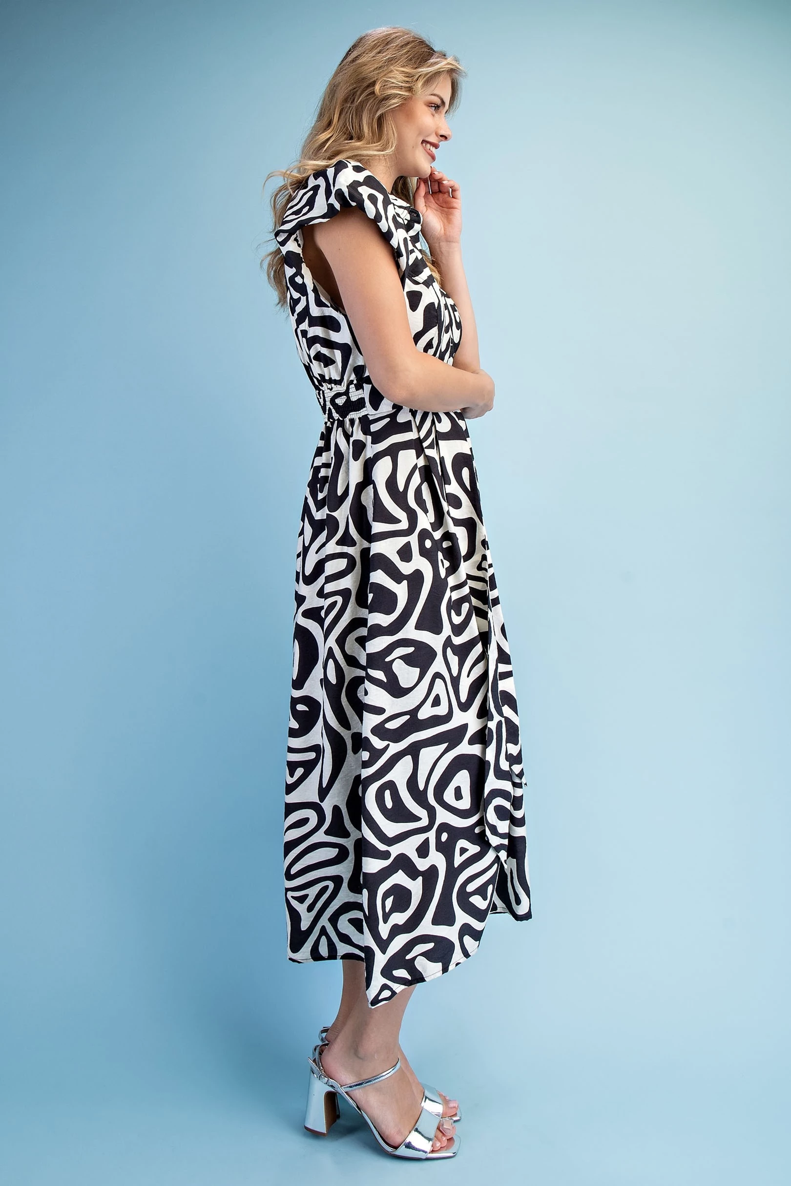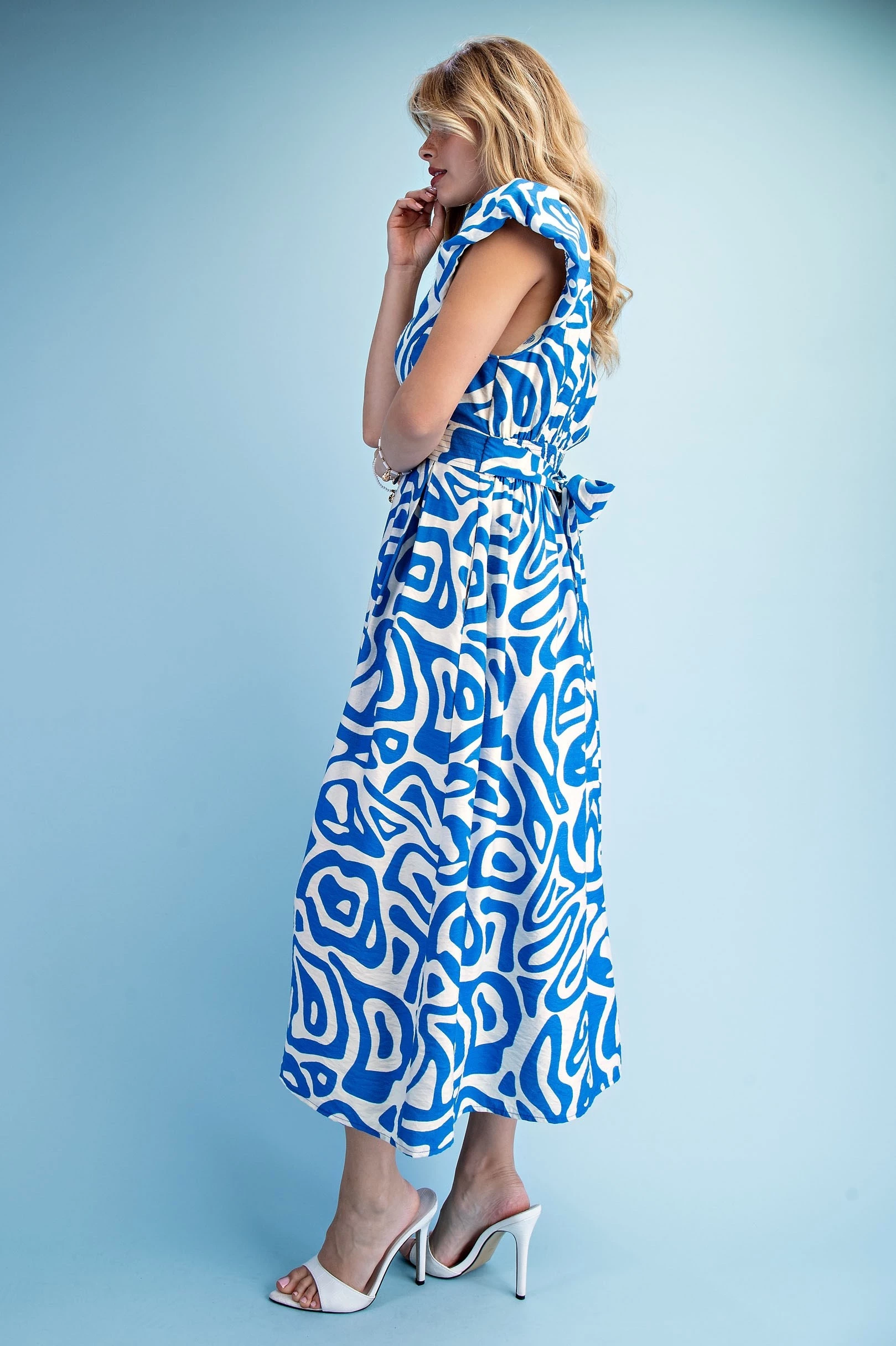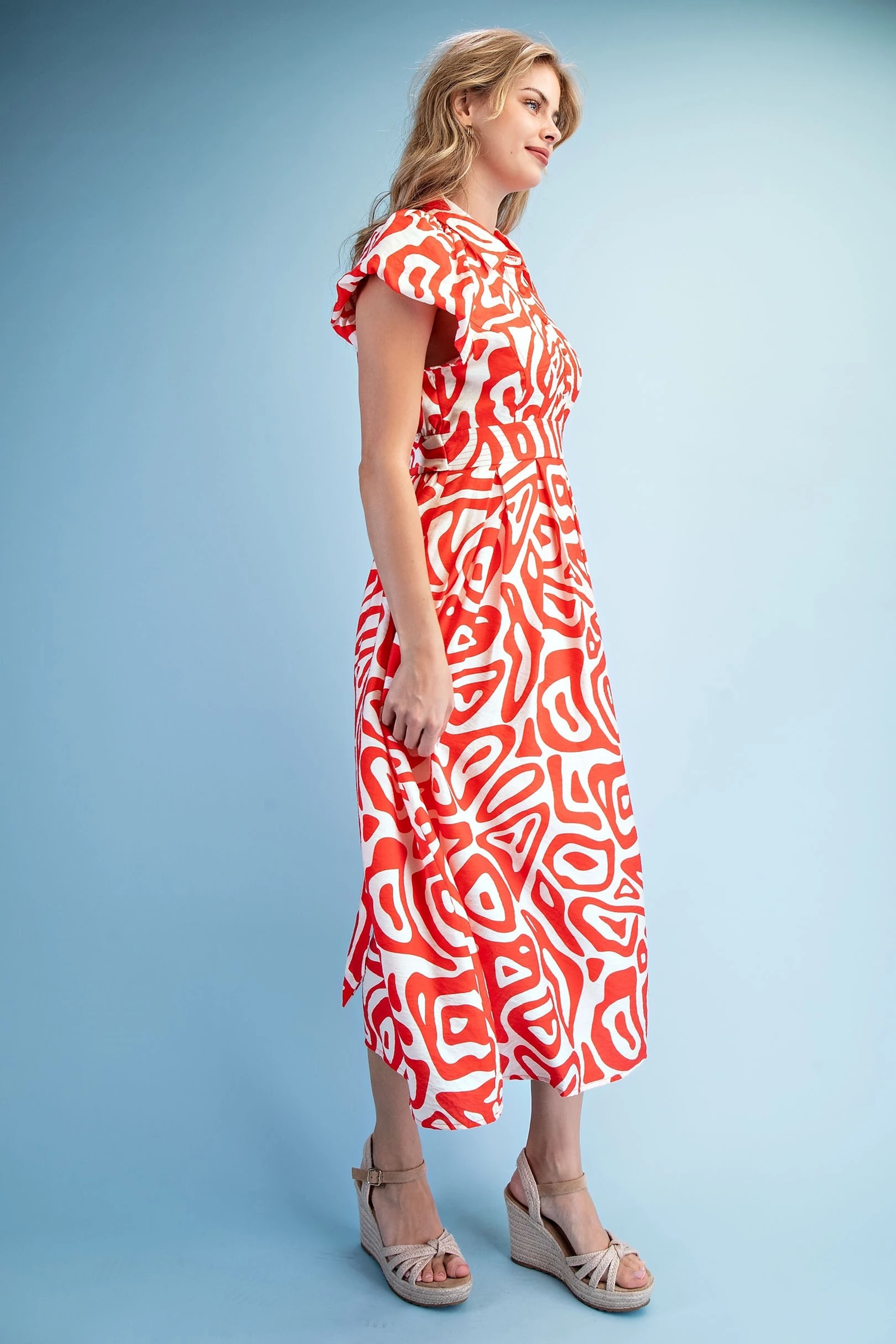 Printed Half Button Midi Shirt Dress with Trapunto Stitching and Back Elastic Waist. The Dress is Lined