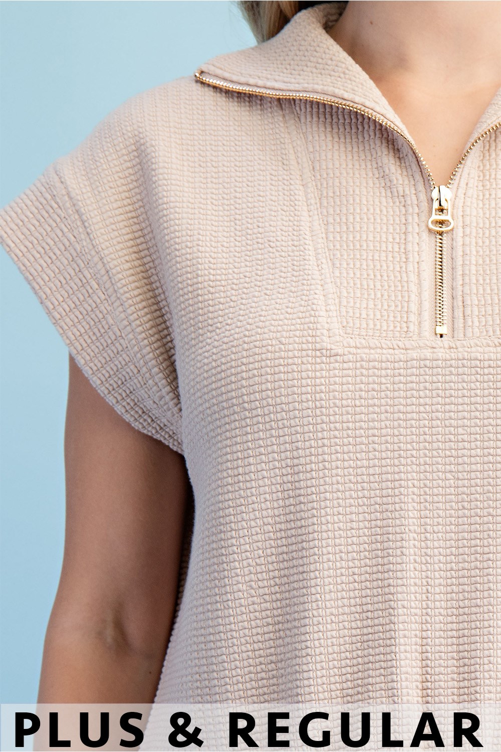 Textured Knit Top with a Half Zip Mock Neck and an Elastic Hem