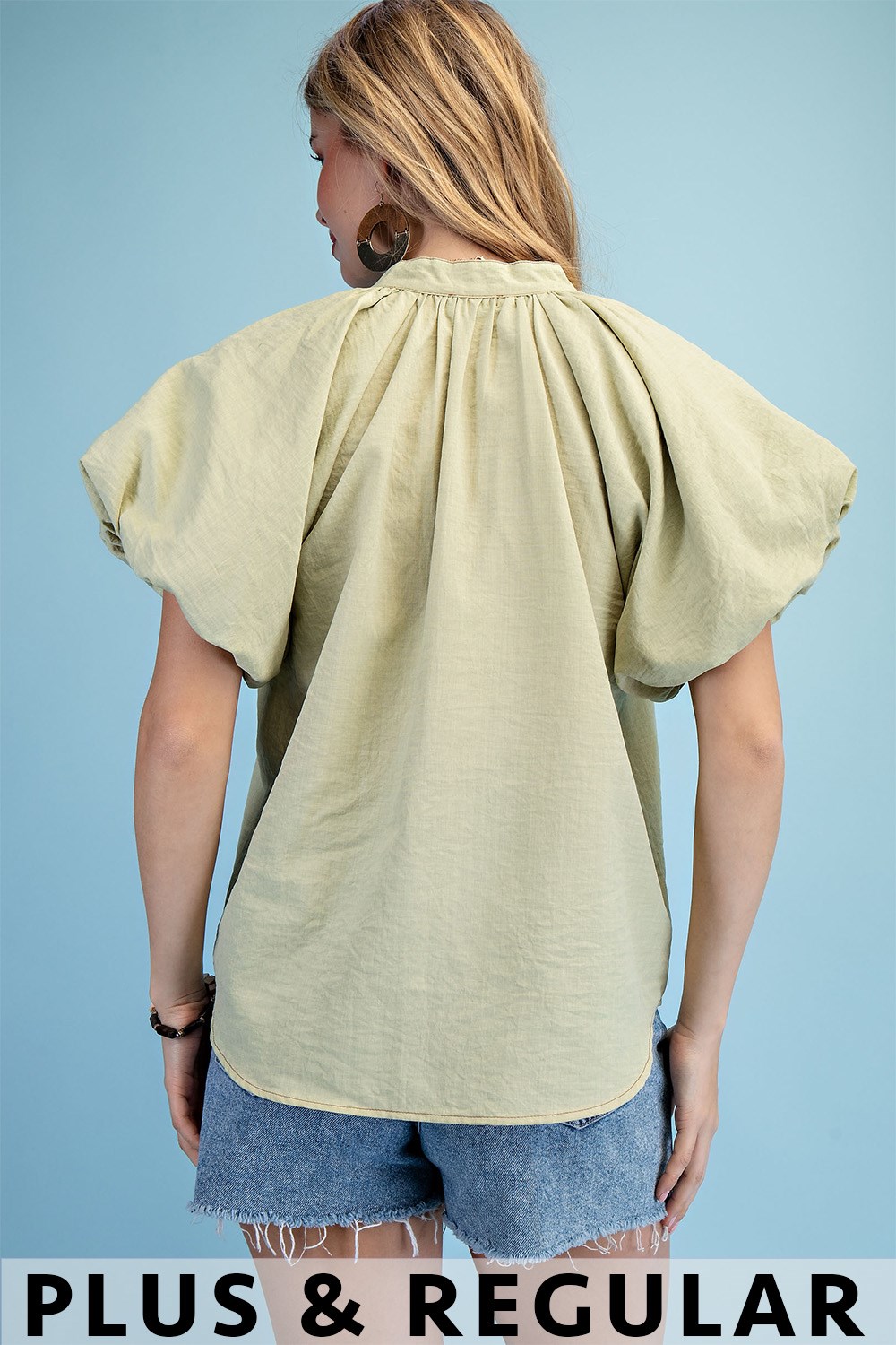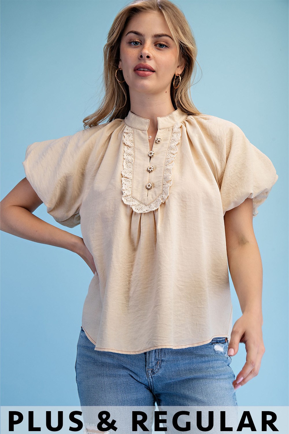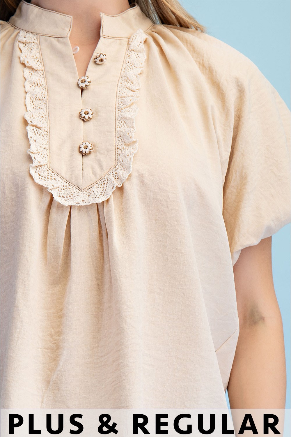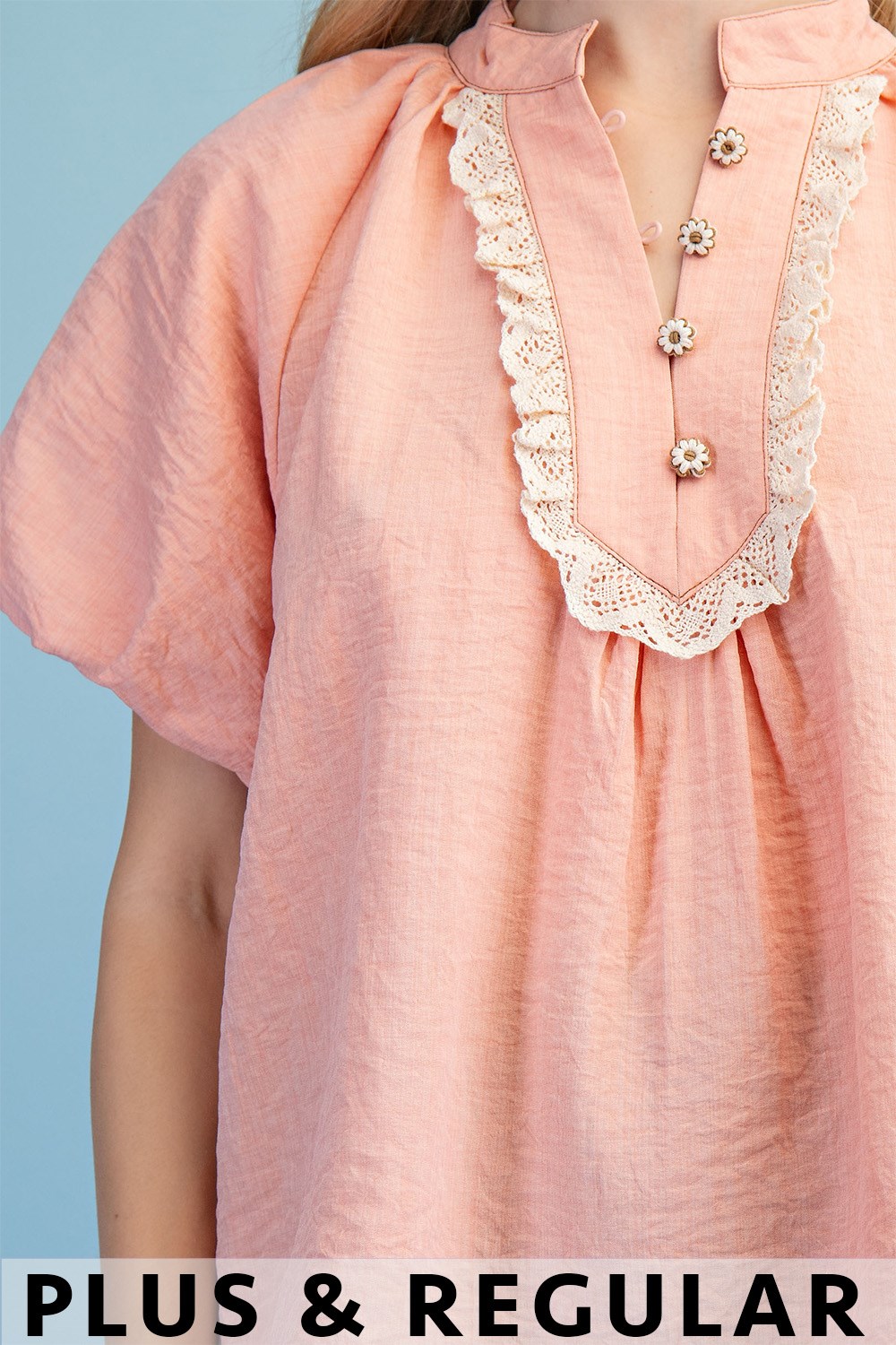 Half Button Short Puff Sleeve Top with a Lace Trim and Thread-Covered Flower Buttons