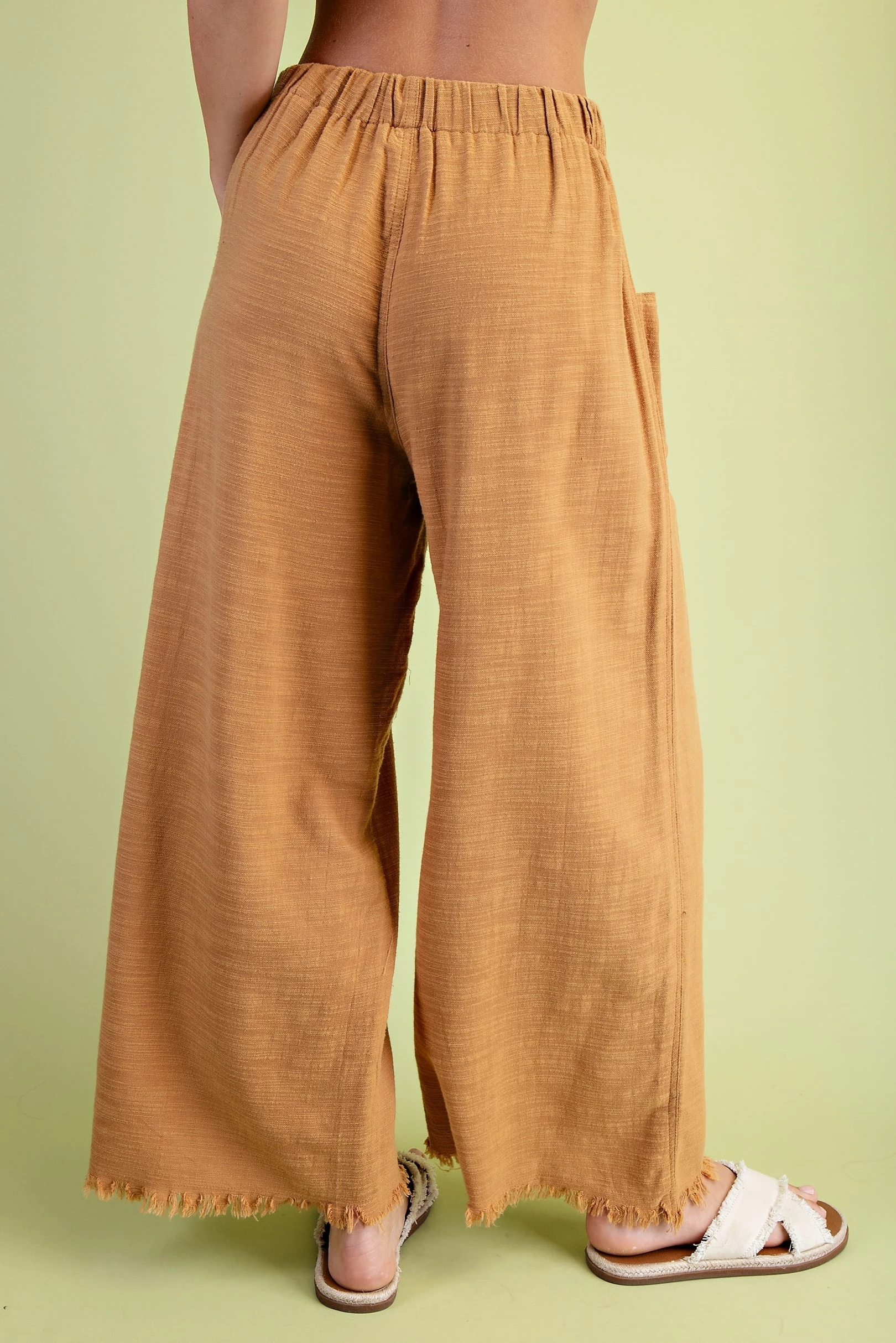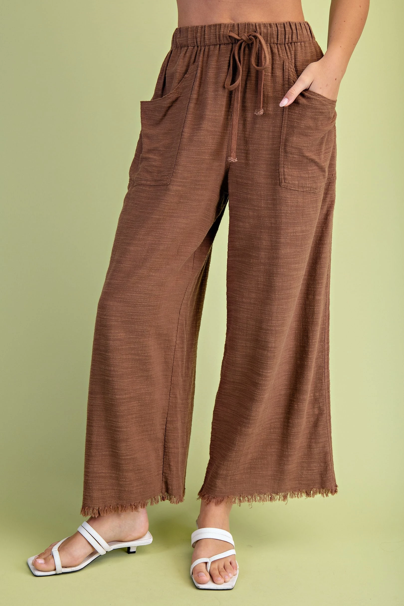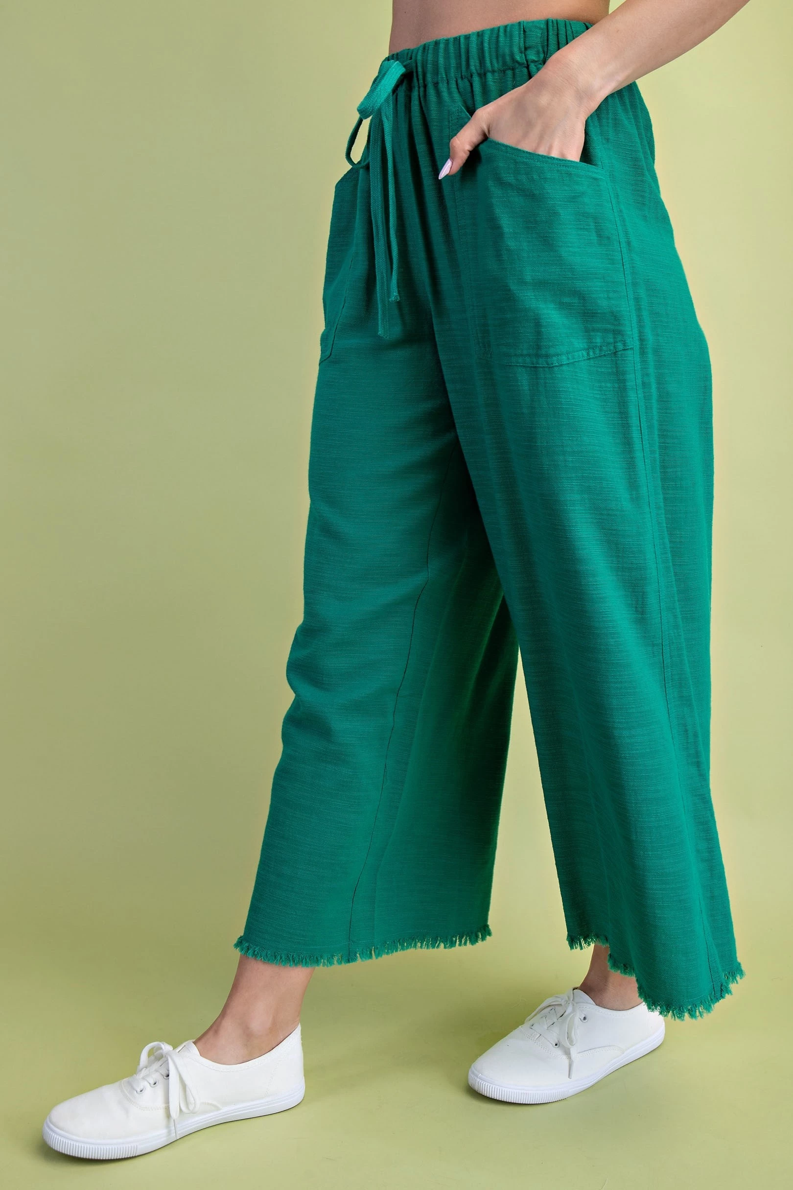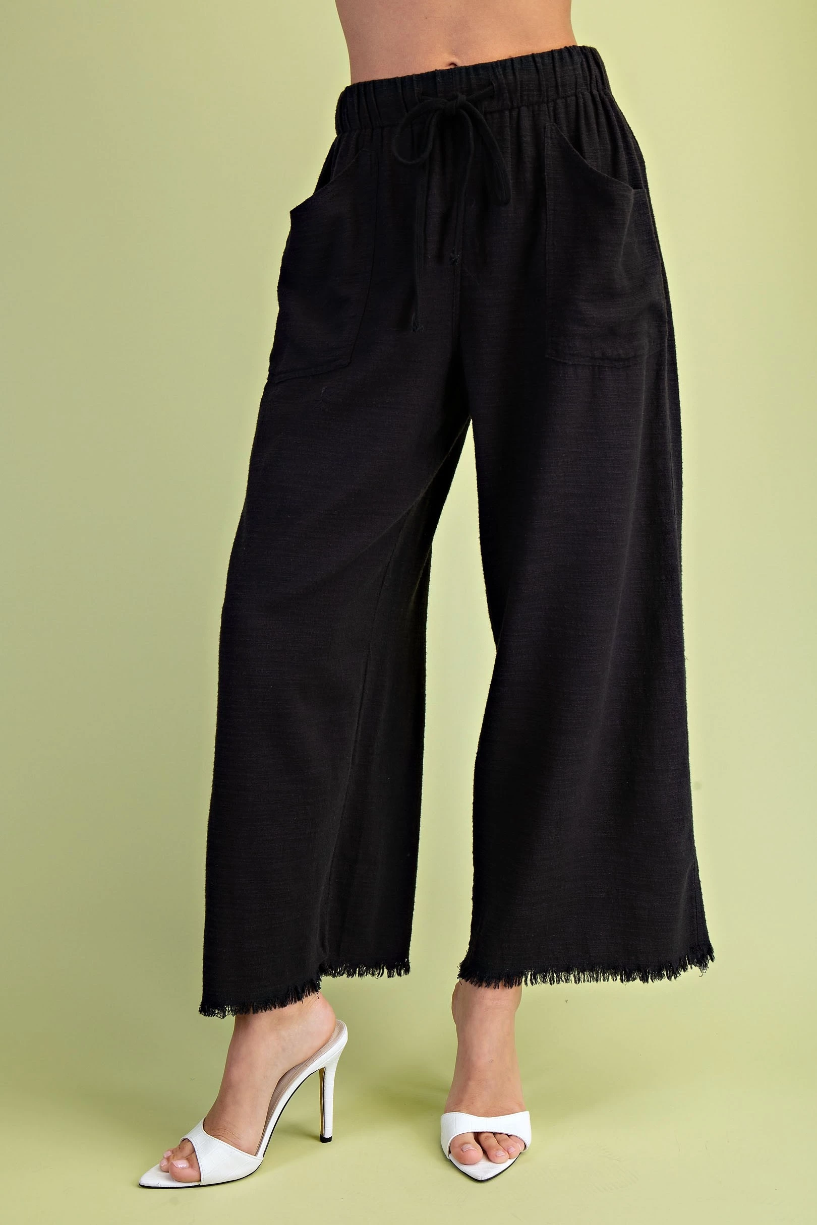 Frayed Cropped Wide Leg Pants with Pockets in a Lightweight Linen Blend